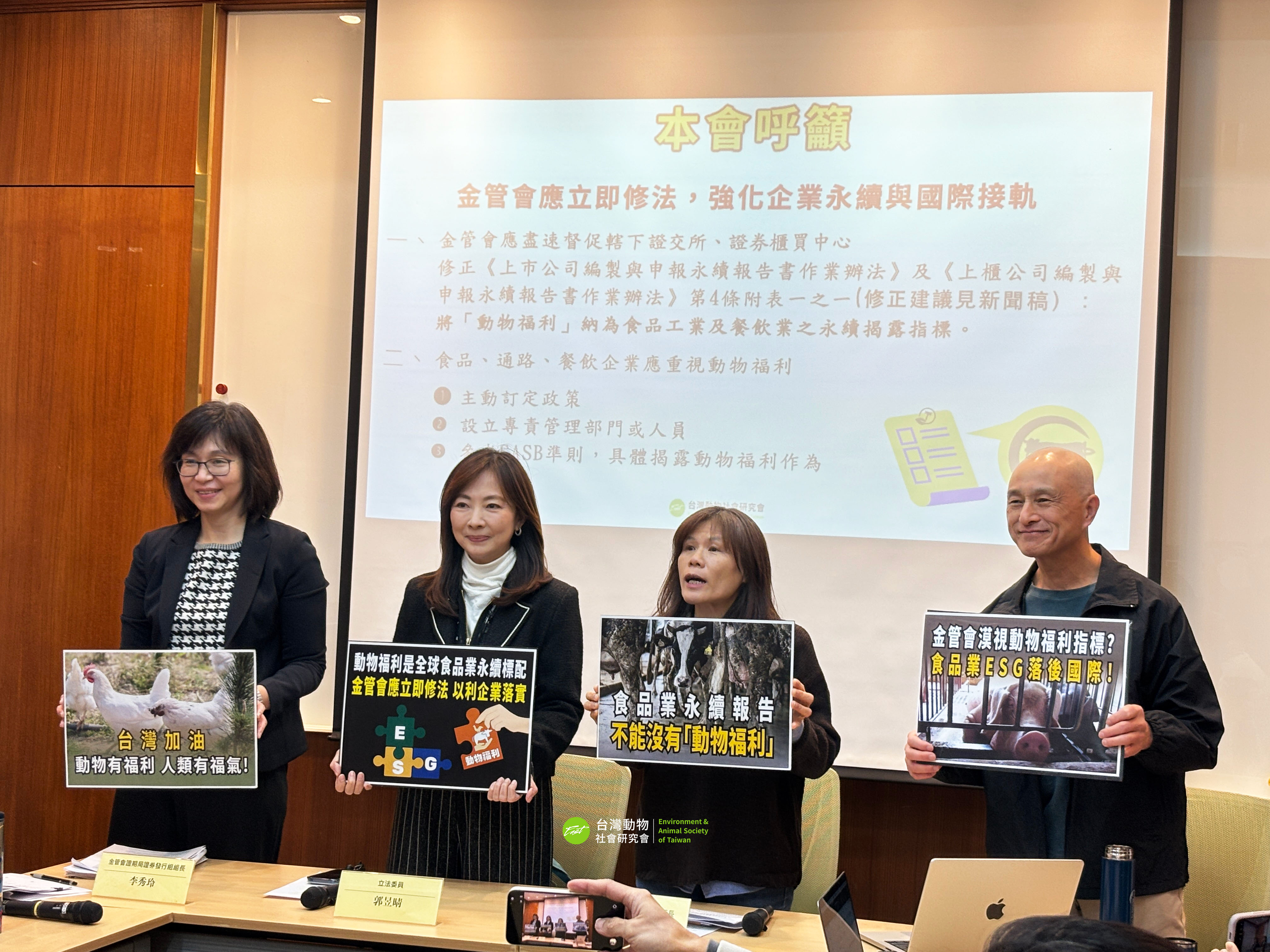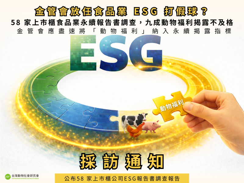 金管會放任食品業 ESG 打假球? 58 家上市櫃食品業永續報告書調查:九成動物福利揭露不及格 呼籲金管會盡速將「動物福利」納入永續揭露指標