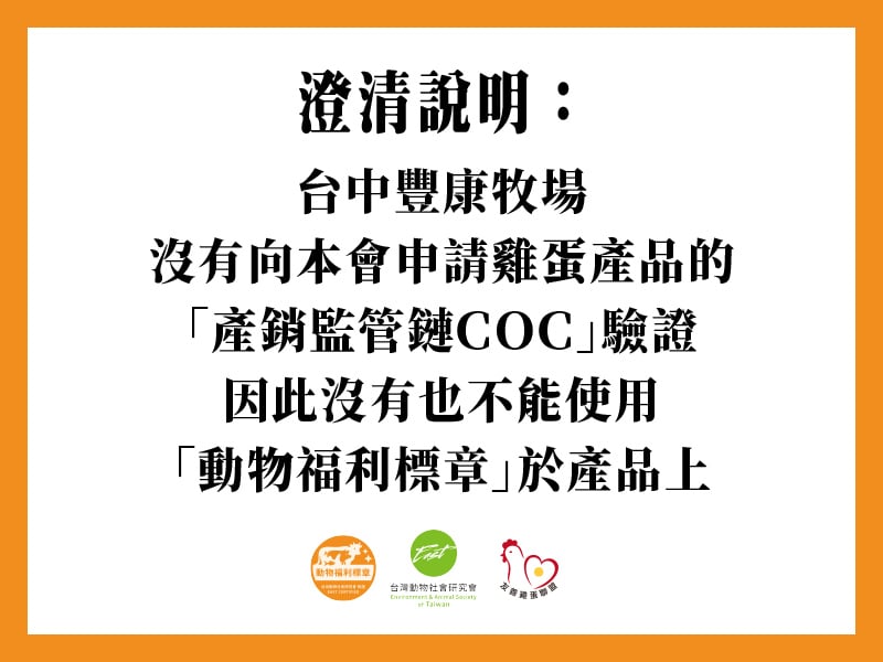 澄清說明:台中豐康牧場沒有向 本會申請雞蛋產品的 「產銷監管鏈COC」驗證 因此不能使用 「動物福利標章」於產品上
