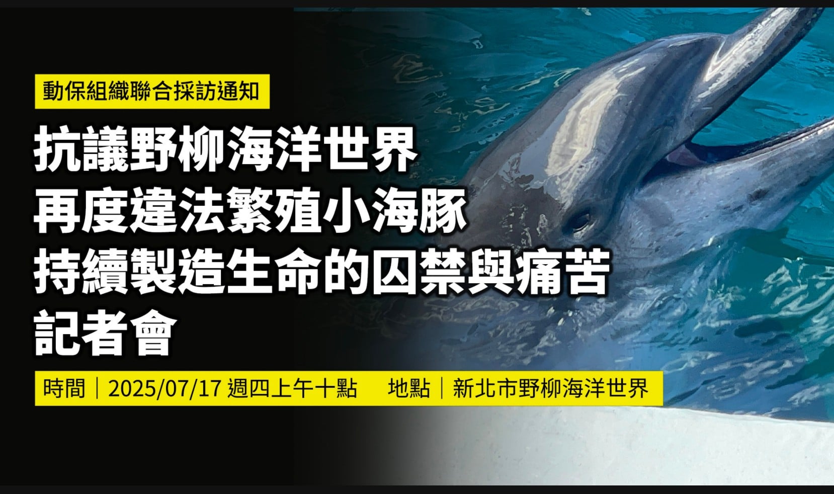 抗議野柳海洋世界 再度違法繁殖小海豚 持續製造生命的囚禁與痛苦 動保團體要求海委會嚴懲累犯 妥善安置園內海豚