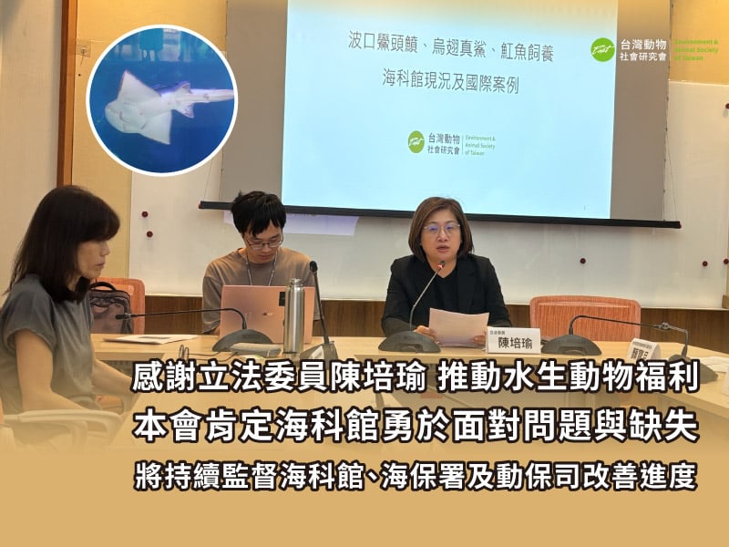 感謝立法委員陳培瑜 推動水生動物福利 本會肯定海科館勇於面對問題與缺失 將持續監督海科館、海保署及動保司改善進度