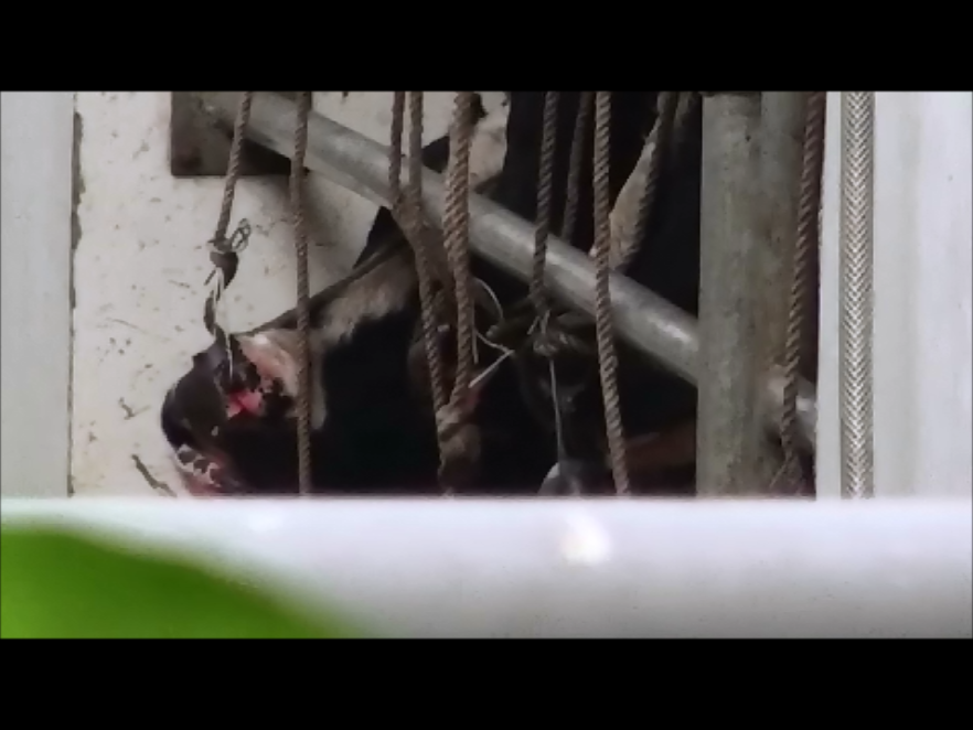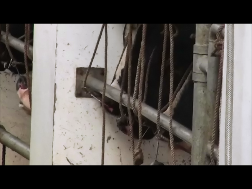 研究會公布的影片顯示,業者為了方便灌水,用繩子將牛的頭綁在欄杆,甚至以鐵絲穿過牛鼻再繫繩綁杆,牛稍微移動便得承受巨大疼痛,不僅無法轉頭、轉身,也無法躺下休息,更導致鼻腔發炎潰爛、流血。