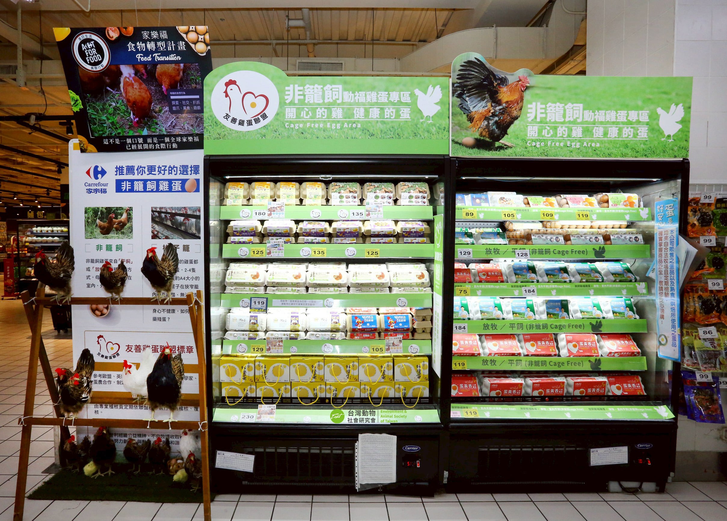 | 家樂福帶動供應商使用非籠飼雞蛋原料,如餅乾和蛋餃 | 家樂福全台門市設立非籠飼雞蛋專區 |