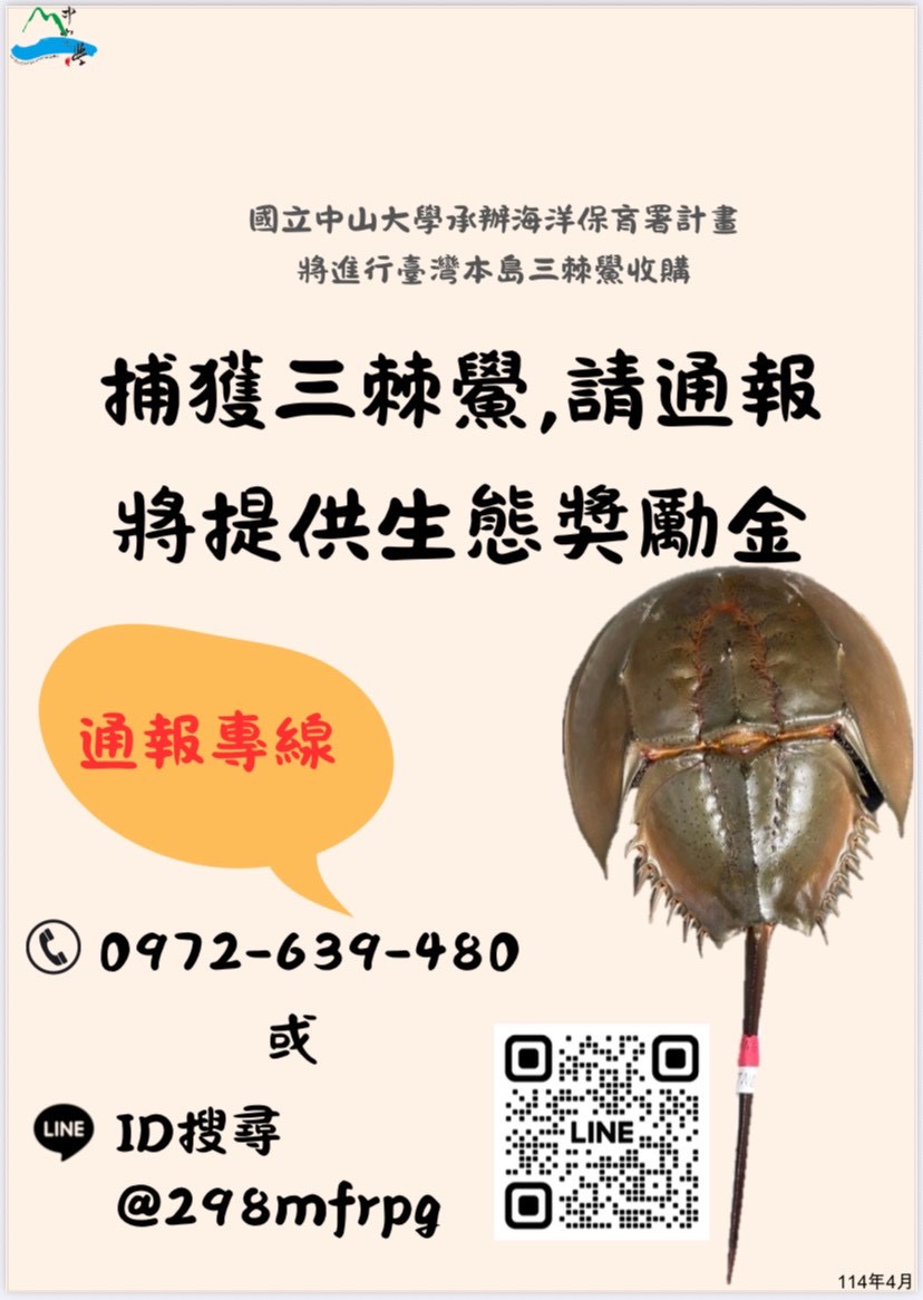 而海保署則委託中山大學海洋事務研究所張懿教授及團隊,進行台灣本島三棘鱟收購計畫,若有遇到任何捕獲通報者,將提供生態獎勵金收購後,進行標示野放。