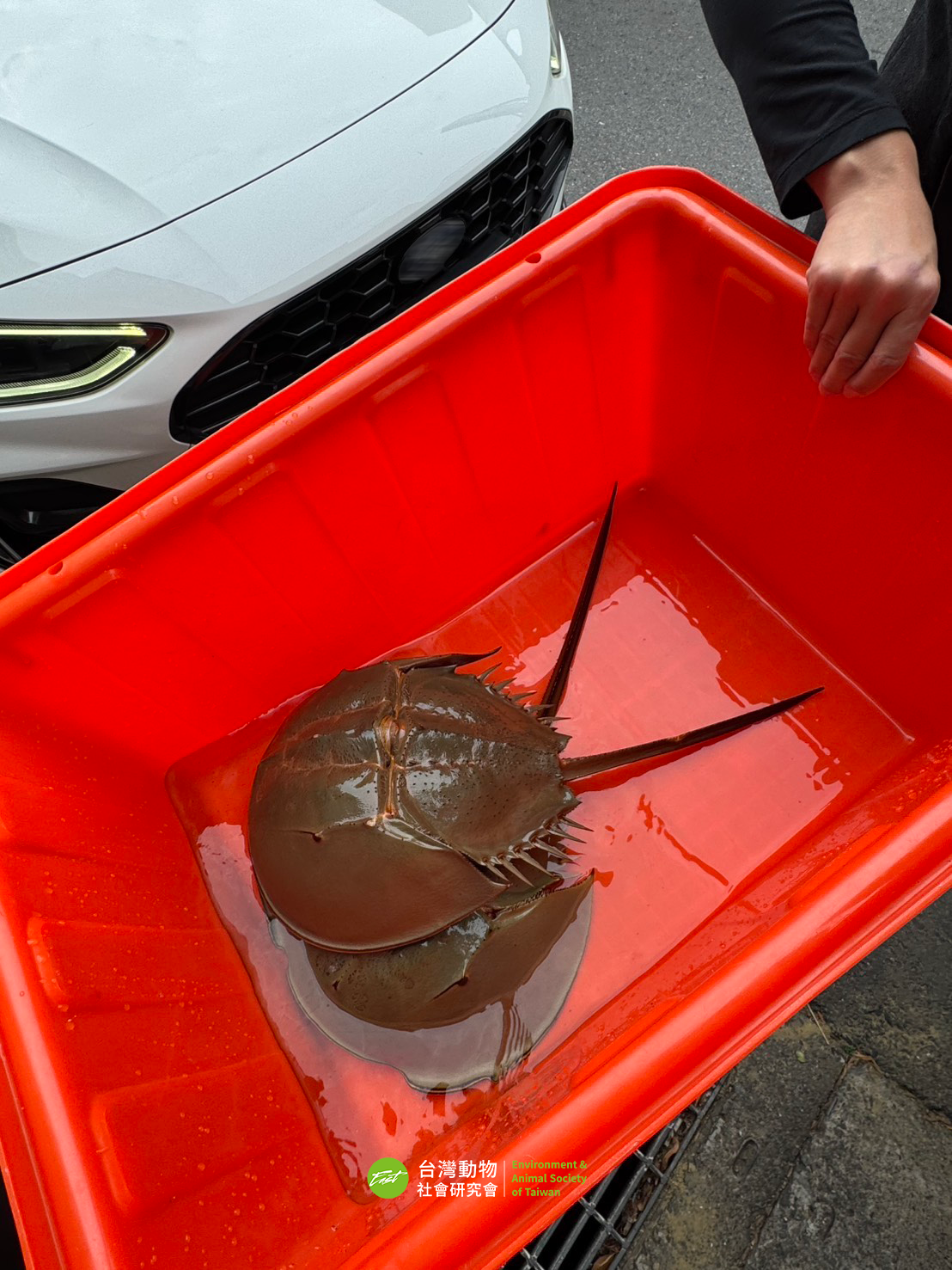 本會同事日前在台北市一處公有市場的魚攤上,赫然看見一對雄雌相依的三棘鱟被捕抓關在水族箱裡。經詢問攤商販售意願後,本會立刻啟動救援並連繫安置,後續將由學術單位進行標記野放。