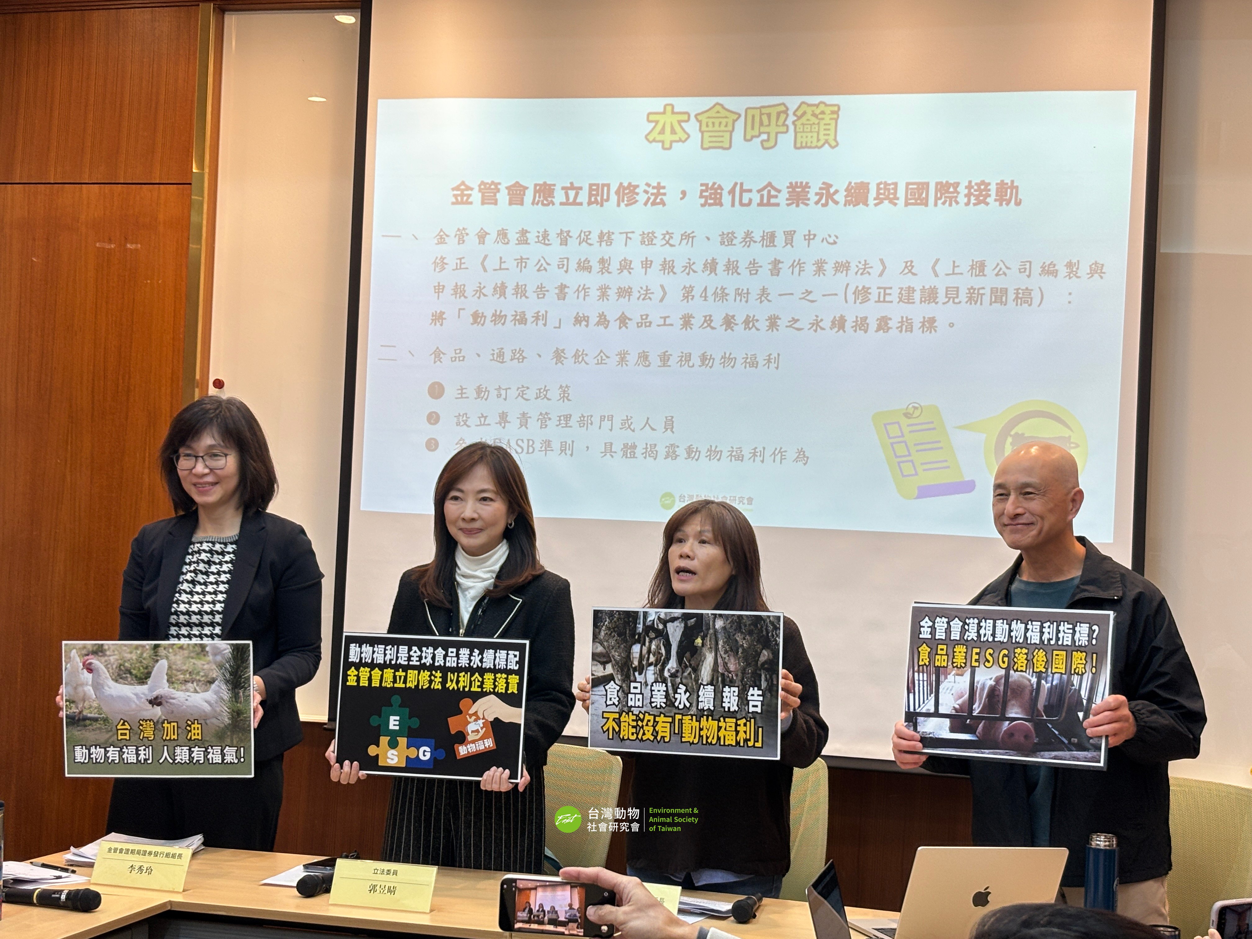 台灣動物社會研究會今日(1/8)偕同立法委員郭昱晴召開記者會,公布《2024上市/櫃食品企業永續報告書落實「動物福利」指標調查》。研究會指出,食品產業大量依賴動物性原料,與經濟動物處境及福利關聯甚鉅,「動物福利」是國際食品產業永續治理(ESG),及人與動物、環境「健康一體」(One Health)的核心指標。重視經濟動物福利有助動物健康、減少抗生素與藥物使用,降低細菌抗藥性風險,對維護糧食與食品安全、減少疫病發生及實踐環境永續至關重要。然而現行金管會轄下的證交所、證券櫃買中心訂定的《上市/櫃公司編製與申報永續報告書作業辦法》,並未要求食品相關產業揭露「動物福利」永續指標,導致我國食品、餐飲、畜牧業於此議題出現重大管理缺口,整體產業永續發展落後國際。本會呼籲金管會儘速督促轄下單位,將「動物福利」納入相關產業必須揭露的永續指標,以接軌國際準則並強化產業競爭力。