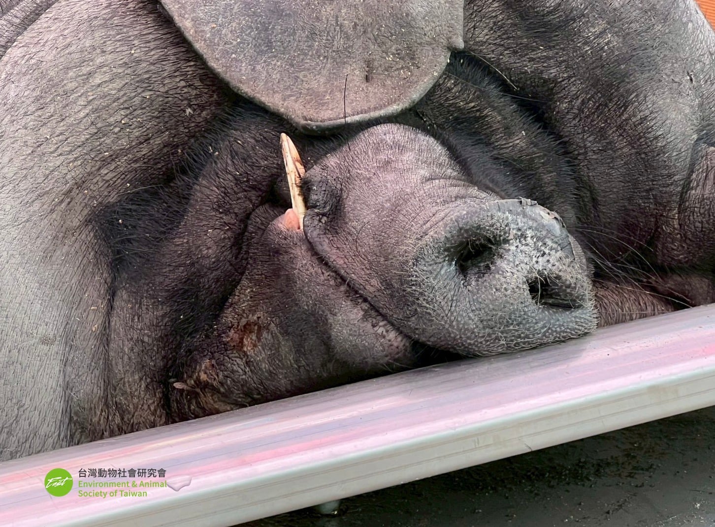 這隻今年被評爲「特等」的神豬,被強迫增肥到1426台斤,幾乎是一隻健康豬隻正常體重的八倍。牠終生被限制行動,胖到癱瘓,無法站立。