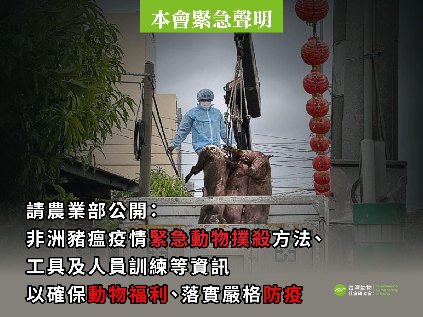 本會緊急聲明|請農業部公開非洲豬瘟疫情緊急動物撲殺 方法、工具及人員訓練等資訊 以確保動物福利、落實嚴格防疫
