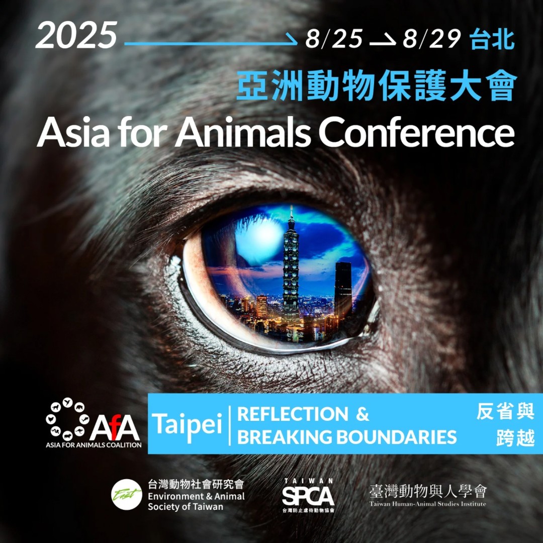 備受期待的第十四屆2025「亞洲動物保護大會AfA雙年會」,將在充滿活力的台北市舉行。大會由國際 AfA 聯盟 Asia for Animals Coalition 與台灣三個動物保護組織——社團法人台灣動物社會研究會 (EAST)、社團法人台灣防止虐待動物協會(TSPCA)、臺灣動物與人學會 (THASI) 共同主辦。