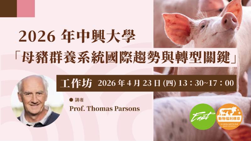 於4月23日與國立中興大學動物科學系合辦【中興大學-邁向母豬群養系統國際趨勢與轉型關鍵】工作坊;4月24日與農業部畜產試驗所合辦【邁向母豬群養系統—如何輔導畜牧場提昇動物福利】國際論壇。